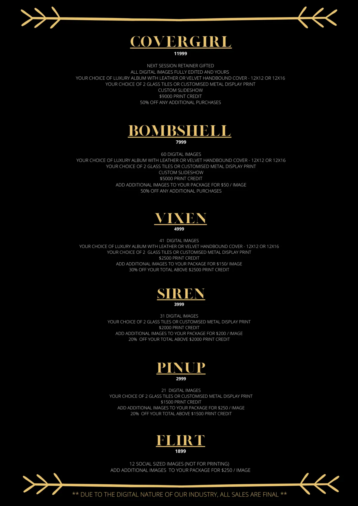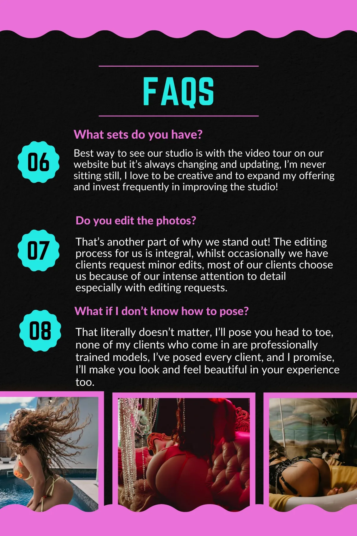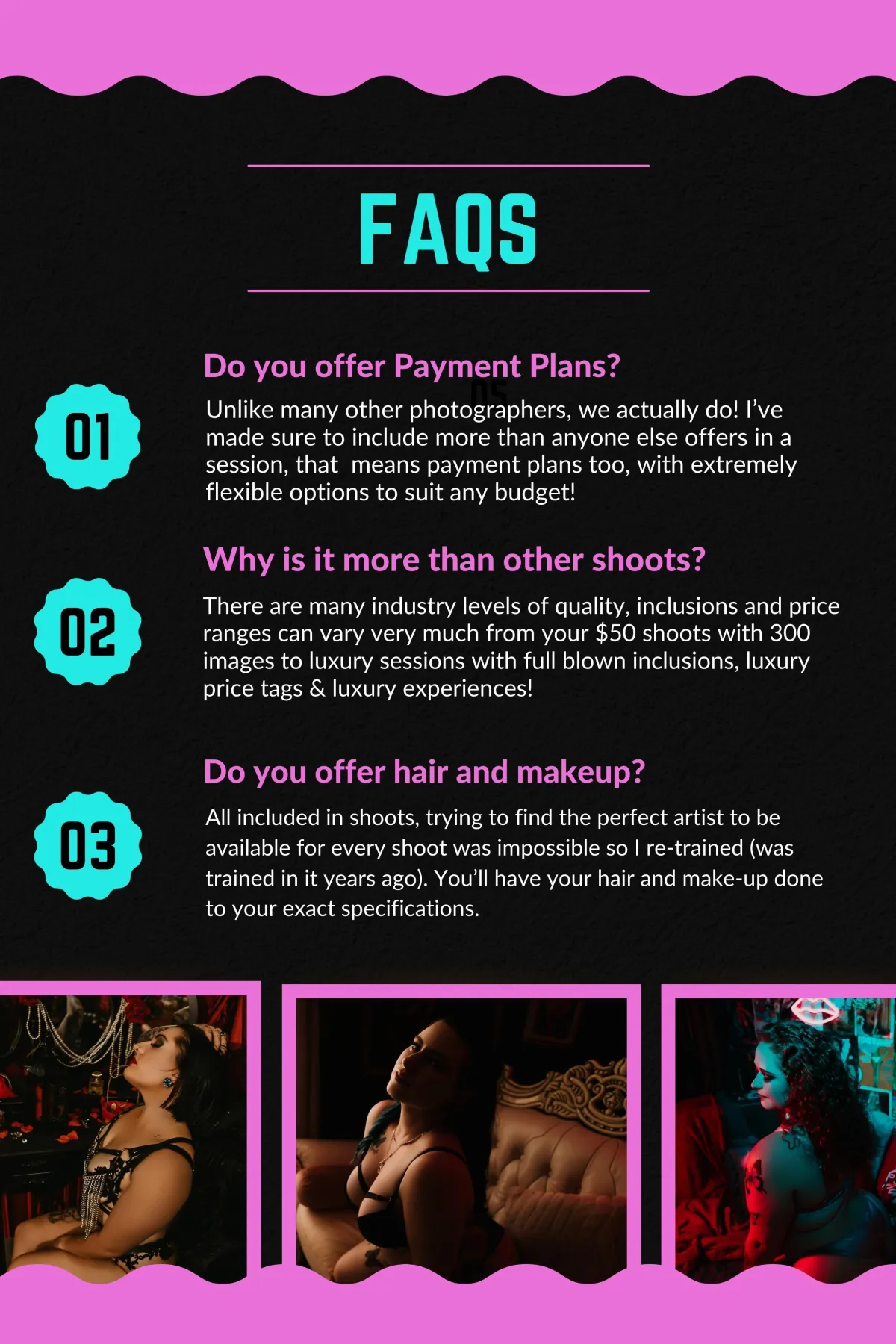 Flexible Payment Plans: We understand that investing in a boudoir shoot is a personal decision, which is why we offer flexible payment plans to suit your budget. Our aim is to make this empowering experience accessible to all, ensuring that financial constraints do not hinder your journey towards self-love and empowerment.