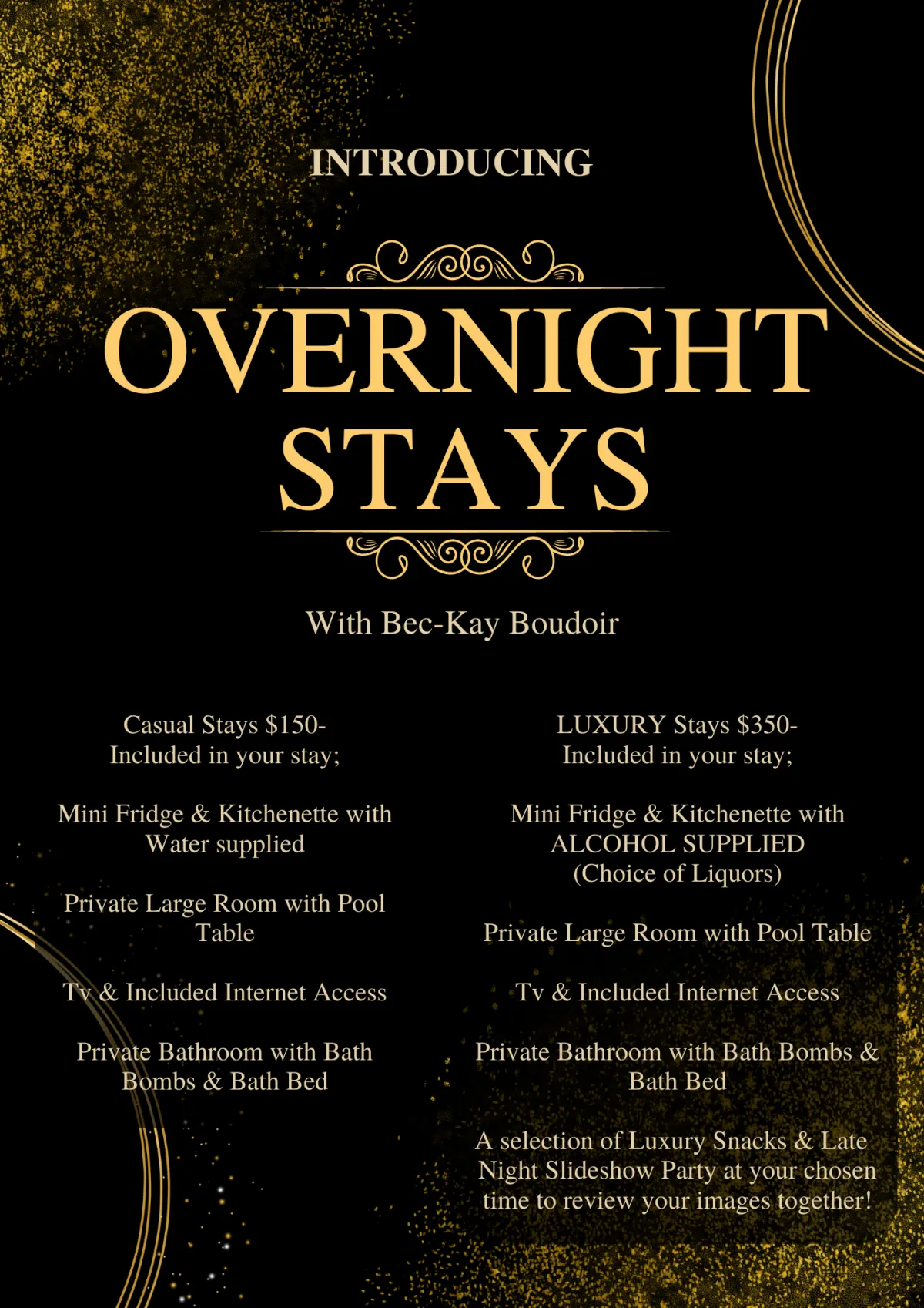 Overnight Stay Option: For those seeking an immersive and unforgettable experience, we offer an overnight stay option. Immerse yourself in luxury as you enjoy a comfortable and stylish accommodation, allowing you to fully relax after your boudoir session. Wake up refreshed and ready to embrace the next day with confidence.