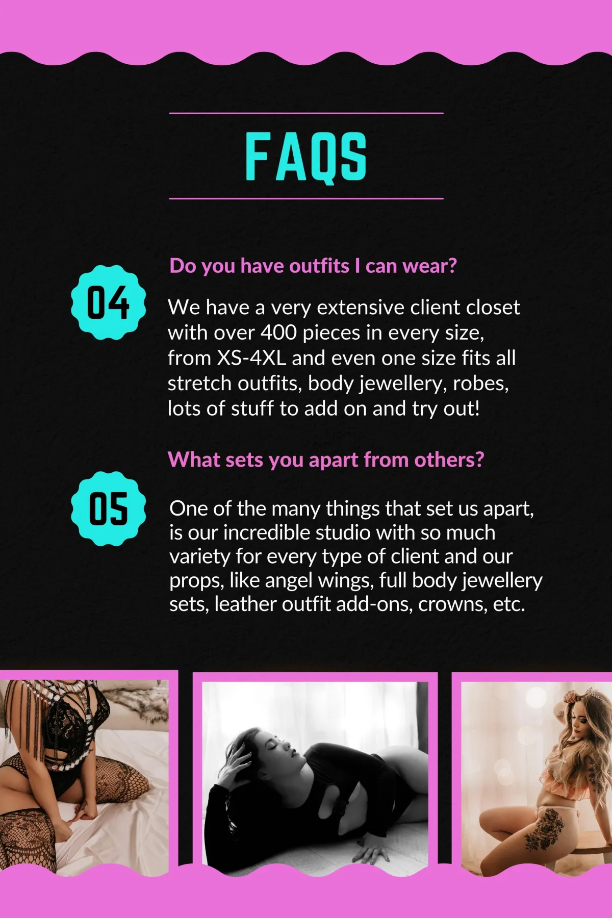 Full Client Closet: To ensure you feel confident and comfortable during your session, we offer a full client closet filled with a wide range of stunning lingerie, accessories, and props. Whether you prefer classic elegance or bold and daring styles, our collection has something to suit every taste and preference. I will guide you in selecting the perfect ensemble that accentuates your unique features and brings out your inner